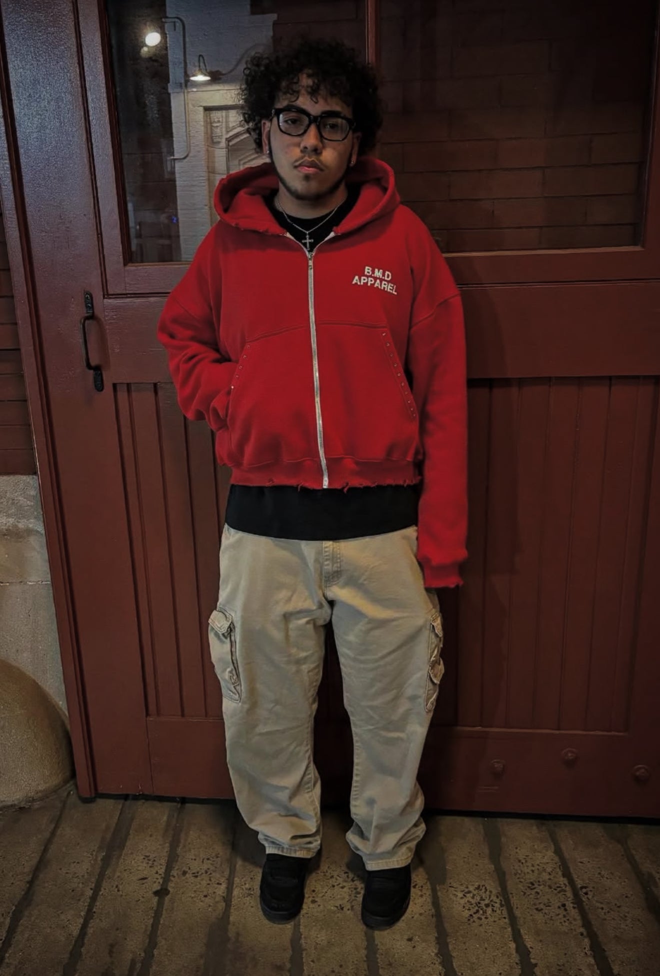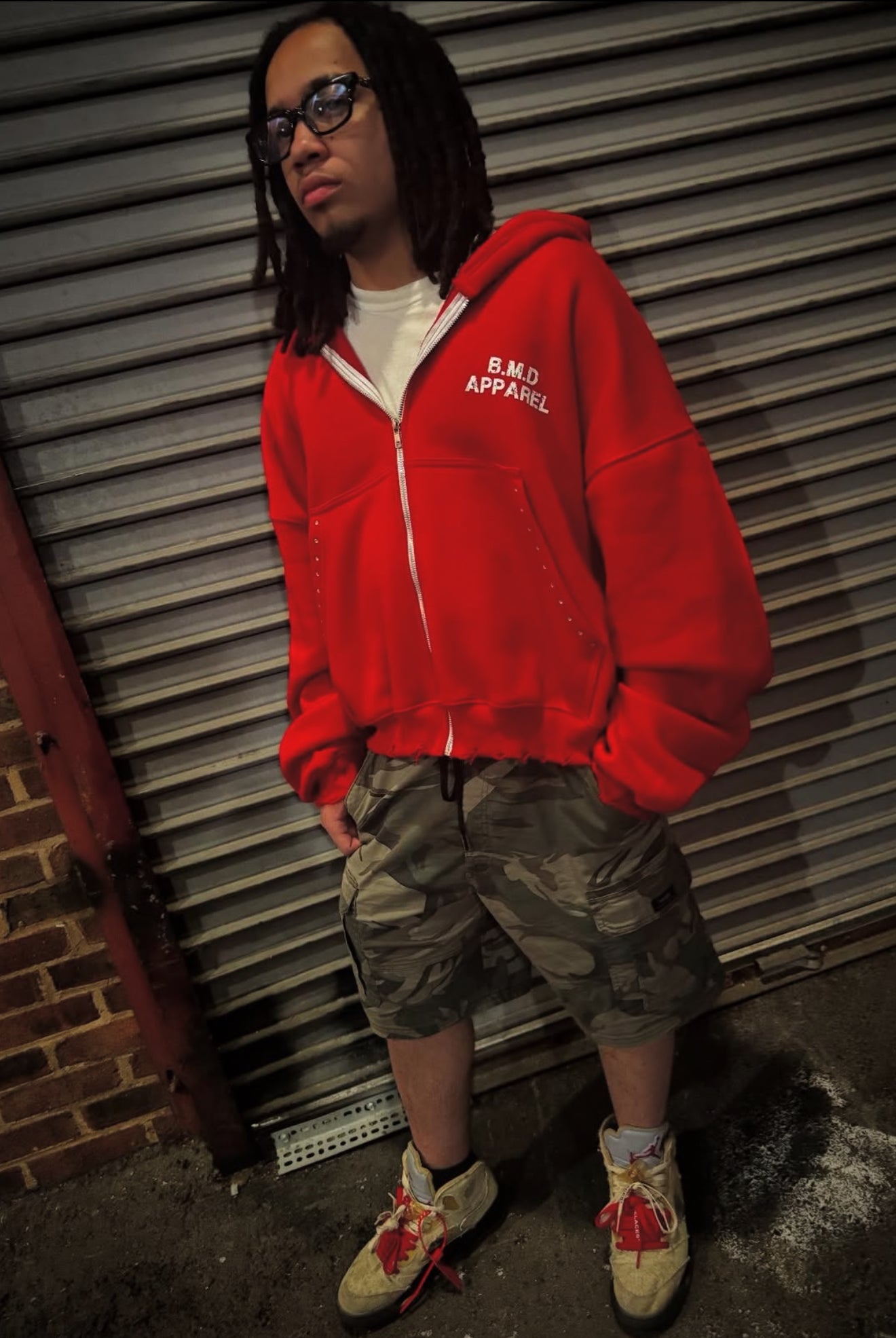 The Vermillion Zip Up Hoodie is a vibrant red B.M.D hoodie that features that baggy look but still cropped at the waist. You can't forget about the rhinestones along the pockets and it also has distressing around the waist, hood, and wrist.